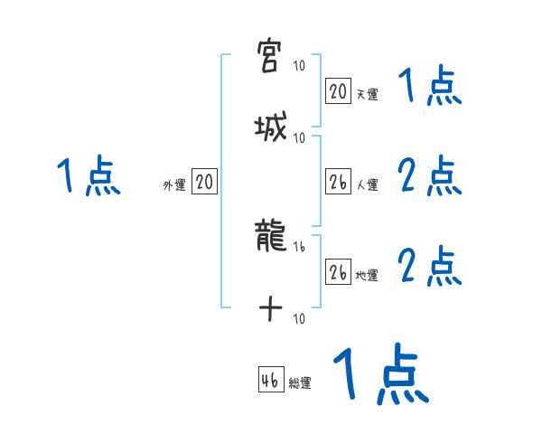 天運![]() | 宮城龍十さんの天運は20画の1つ星!社交が苦手。人とは違った才能があり波乱万丈な人生かも。 家系が持つ宿命的な運勢を表します。祖先から受け継いだ苗字ですので自分の力が及びません。家柄を象徴します。 |