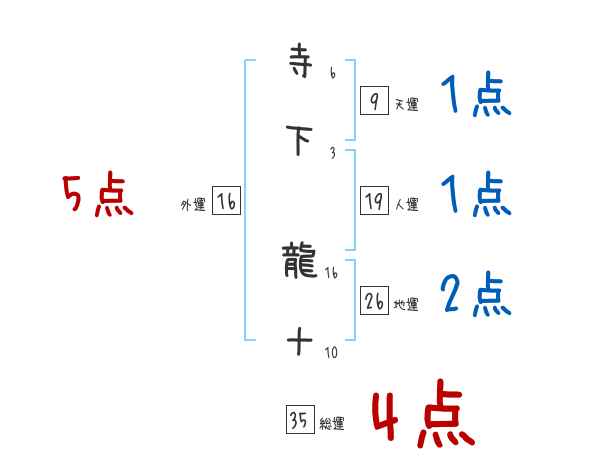 外運![]() | 寺下龍十さんの外運は16画の5つ星!人望が厚く大きく発展する。逆転成功が見える。 生活面を象徴する運勢です。外部から受ける影響力を表し、結婚運、家庭運や職場、環境への順応性を表します。 |