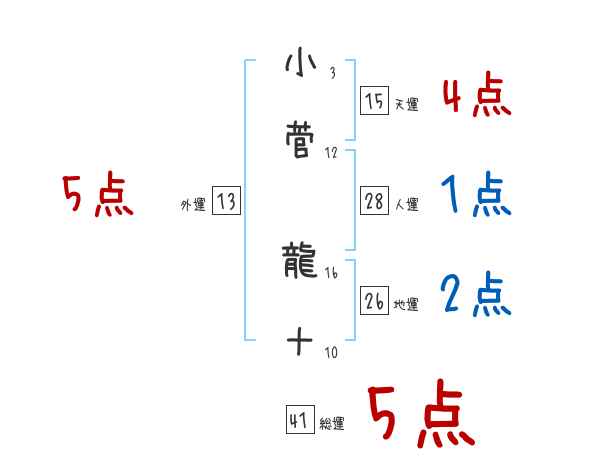 人運![]() | 小菅龍十さんの人運は28画の1つ星!家庭環境に注意。スポーツで活躍できる能力があるかも。 性格や才能などを表す2番目に重要な運勢です。人間関係や協調性、社会的な成功に影響します。主に20歳から50歳ぐらいまでの中年期の運勢を表します。 |