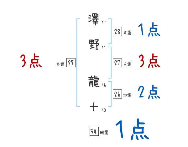天運![]() | 澤野龍十さんの天運は28画の1つ星!家庭環境に注意。スポーツで活躍できる能力があるかも。 家系が持つ宿命的な運勢を表します。祖先から受け継いだ苗字ですので自分の力が及びません。家柄を象徴します。 |