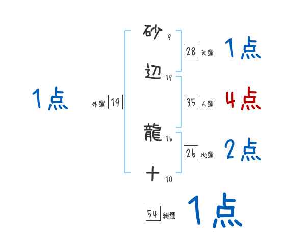 外運![]() | 砂辺龍十さんの外運は19画の1つ星!優れた才能を持ちますが、協調性が足りないことも。周りの人と協力する事を意識しましょう。 生活面を象徴する運勢です。外部から受ける影響力を表し、結婚運、家庭運や職場、環境への順応性を表します。 |