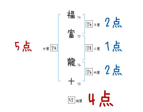 外運![]() | 福富龍十さんの外運は24画の5つ星!家庭運が良く順調な人生。金運にも恵まれる。 生活面を象徴する運勢です。外部から受ける影響力を表し、結婚運、家庭運や職場、環境への順応性を表します。 |
