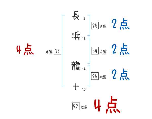 外運![]() | 長浜龍十さんの外運は18画の4つ星!情熱的で剛気。忍耐力があり信頼される。 生活面を象徴する運勢です。外部から受ける影響力を表し、結婚運、家庭運や職場、環境への順応性を表します。 |