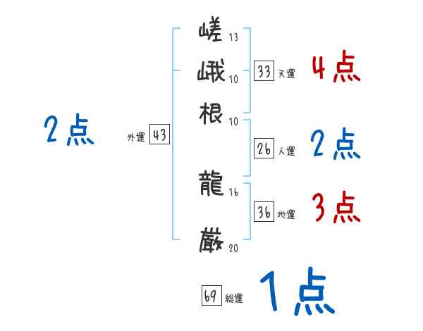 総運![]() | 嵯峨根龍厳さんの総運は69画の1つ星!不満を感じやすい傾向が。ストレスを貯めないように注意しましょう。 あなたの人生を表す1番重要な運勢です。生涯を通じて影響する総合運となり、主に50歳以降の晩年期に影響を及ぼします。 |