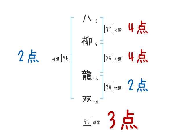総運![]() | 八柳龍双さんの総運は51画の3つ星!変化が激しく、危険に注意。堅実な性格。 あなたの人生を表す1番重要な運勢です。生涯を通じて影響する総合運となり、主に50歳以降の晩年期に影響を及ぼします。 |