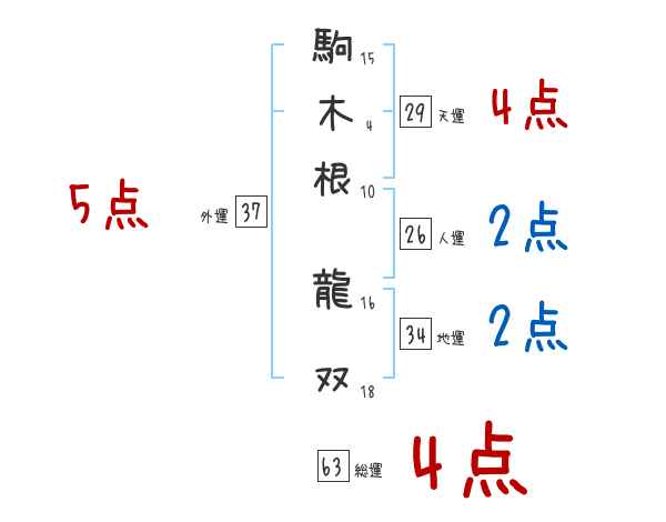 総運![]() | 駒木根龍双さんの総運は63画の4つ星!家庭運がよく順調な生活。温和な性格。 あなたの人生を表す1番重要な運勢です。生涯を通じて影響する総合運となり、主に50歳以降の晩年期に影響を及ぼします。 |