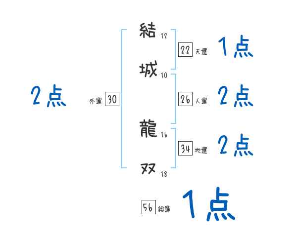 天運![]() | 結城龍双さんの天運は22画の1つ星!努力することが苦手ないっぽう手先が器用。芸術性にも優れる。 家系が持つ宿命的な運勢を表します。祖先から受け継いだ苗字ですので自分の力が及びません。家柄を象徴します。 |