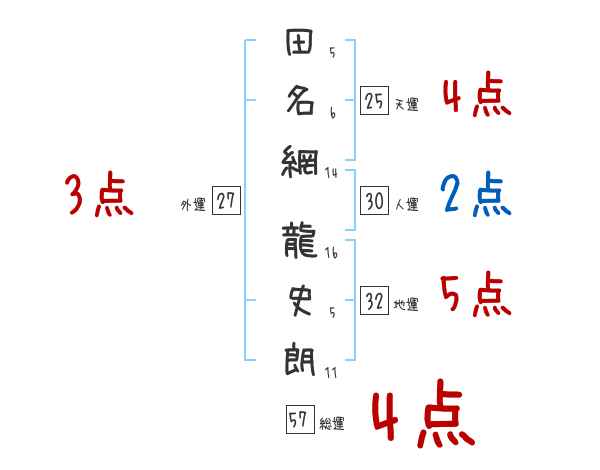 総運![]() | 田名網龍史朗さんの総運は57画の4つ星!向上心があり人望がある。地位を得る。 あなたの人生を表す1番重要な運勢です。生涯を通じて影響する総合運となり、主に50歳以降の晩年期に影響を及ぼします。 |