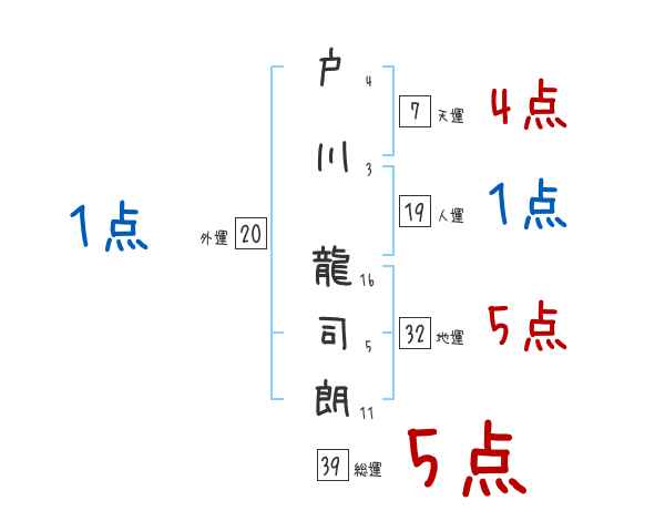 天運![]() | 戸川龍司朗さんの天運は7画の4つ星!強い意志や信念を持ち独立心が強い。自立する。 家系が持つ宿命的な運勢を表します。祖先から受け継いだ苗字ですので自分の力が及びません。家柄を象徴します。 |