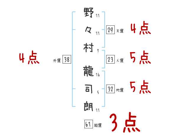 天運![]() | 野々村龍司朗さんの天運は29画の4つ星!完全主義で才能がある。厳格な心の持ち主。 家系が持つ宿命的な運勢を表します。祖先から受け継いだ苗字ですので自分の力が及びません。家柄を象徴します。 |