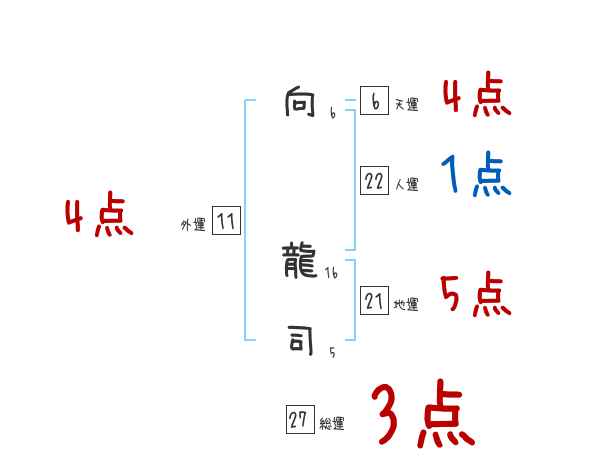 総運![]() | 向龍司さんの総運は27画の3つ星!頭脳明晰だが強情で摩擦が多い傾向。孤立に注意。 あなたの人生を表す1番重要な運勢です。生涯を通じて影響する総合運となり、主に50歳以降の晩年期に影響を及ぼします。 |