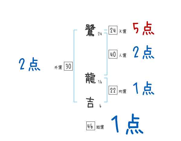 天運![]() | 鷺龍吉さんの天運は24画の5つ星!家庭運が良く順調な人生。金運にも恵まれる。 家系が持つ宿命的な運勢を表します。祖先から受け継いだ苗字ですので自分の力が及びません。家柄を象徴します。 |