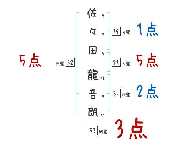 外運![]() | 佐々田龍吾朗さんの外運は32画の5つ星!柔軟性があり成功する。チャンスが多く金運が良い。 生活面を象徴する運勢です。外部から受ける影響力を表し、結婚運、家庭運や職場、環境への順応性を表します。 |