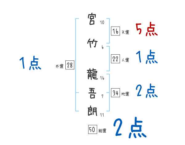 人運![]() | 宮竹龍吾朗さんの人運は22画の1つ星!努力することが苦手ないっぽう手先が器用。芸術性にも優れる。 性格や才能などを表す2番目に重要な運勢です。人間関係や協調性、社会的な成功に影響します。主に20歳から50歳ぐらいまでの中年期の運勢を表します。 |