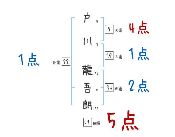 | 天運  | 戸川龍吾朗さんの天運は7画の4つ星!強い意志や信念を持ち独立心が強い。自立する。家系が持つ宿命的な運勢を表します。祖先から受け継いだ苗字ですので自分の力が及びません。家柄を象徴します。 |