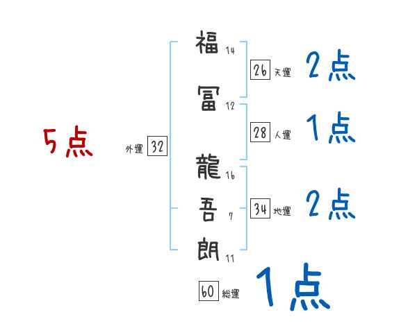 外運![]() | 福冨龍吾朗さんの外運は32画の5つ星!柔軟性があり成功する。チャンスが多く金運が良い。 生活面を象徴する運勢です。外部から受ける影響力を表し、結婚運、家庭運や職場、環境への順応性を表します。 |