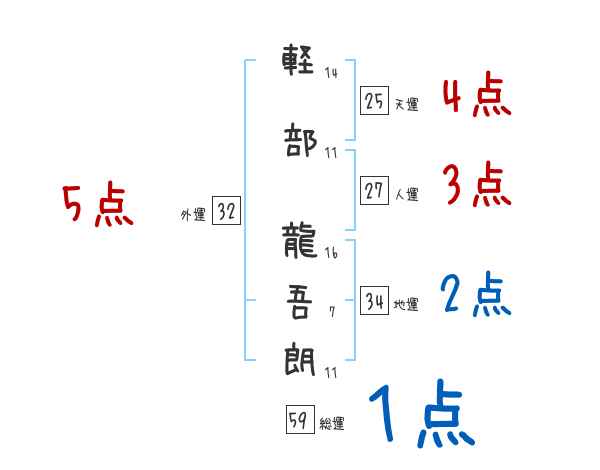 外運![]() | 軽部龍吾朗さんの外運は32画の5つ星!柔軟性があり成功する。チャンスが多く金運が良い。 生活面を象徴する運勢です。外部から受ける影響力を表し、結婚運、家庭運や職場、環境への順応性を表します。 |