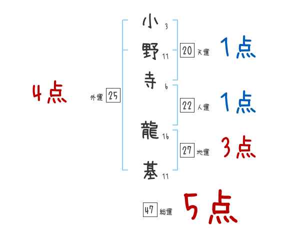 総運![]() | 小野寺龍基さんの総運は47画の5つ星!実力が開花し発展する円満な人生。財に恵まれる。 あなたの人生を表す1番重要な運勢です。生涯を通じて影響する総合運となり、主に50歳以降の晩年期に影響を及ぼします。 |