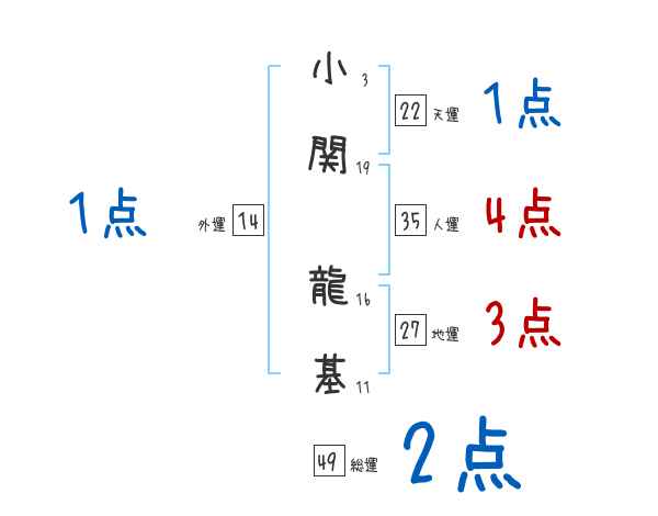 天運![]() | 小関龍基さんの天運は22画の1つ星!努力することが苦手ないっぽう手先が器用。芸術性にも優れる。 家系が持つ宿命的な運勢を表します。祖先から受け継いだ苗字ですので自分の力が及びません。家柄を象徴します。 |