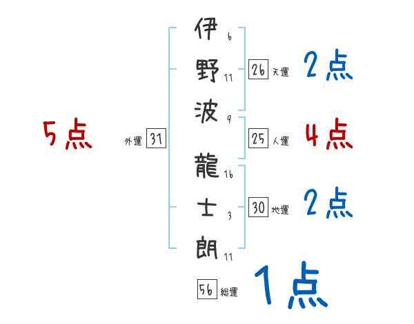 外運![]() | 伊野波龍士朗さんの外運は31画の5つ星!社交性があり判断力に優れる。順風満帆な人生で円満な生活。 生活面を象徴する運勢です。外部から受ける影響力を表し、結婚運、家庭運や職場、環境への順応性を表します。 |