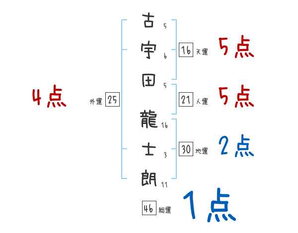 天運![]() | 古宇田龍士朗さんの天運は16画の5つ星!人望が厚く大きく発展する。逆転成功が見える。 家系が持つ宿命的な運勢を表します。祖先から受け継いだ苗字ですので自分の力が及びません。家柄を象徴します。 |