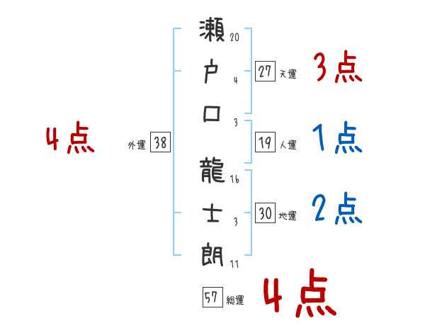 天運![]() | 瀬戸口龍士朗さんの天運は27画の3つ星!頭脳明晰だが強情で摩擦が多い傾向。孤立に注意。 家系が持つ宿命的な運勢を表します。祖先から受け継いだ苗字ですので自分の力が及びません。家柄を象徴します。 |