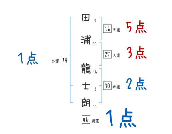 外運![]() | 田浦龍士朗さんの外運は19画の1つ星!優れた才能を持ちますが、協調性が足りないことも。周りの人と協力する事を意識しましょう。 生活面を象徴する運勢です。外部から受ける影響力を表し、結婚運、家庭運や職場、環境への順応性を表します。 |
