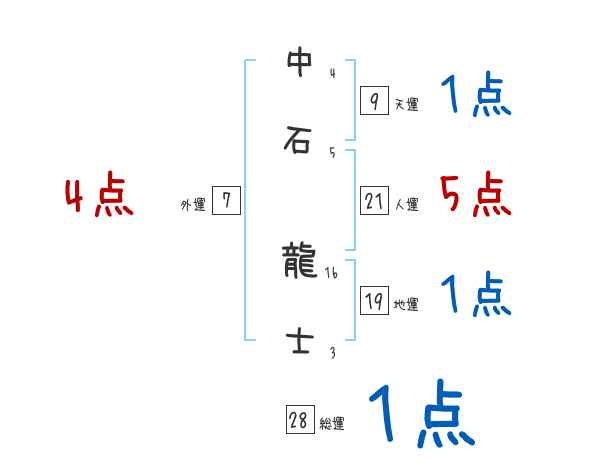 総運![]() | 中石龍士さんの総運は28画の1つ星!家庭環境に注意。スポーツで活躍できる能力があるかも。 あなたの人生を表す1番重要な運勢です。生涯を通じて影響する総合運となり、主に50歳以降の晩年期に影響を及ぼします。 |