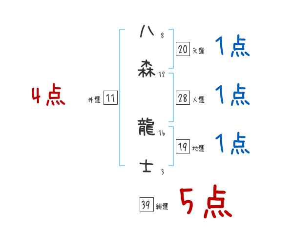 総運![]() | 八森龍士さんの総運は39画の5つ星!社交性に優れ人望が厚い。人の上に立ち成功する。 あなたの人生を表す1番重要な運勢です。生涯を通じて影響する総合運となり、主に50歳以降の晩年期に影響を及ぼします。 |