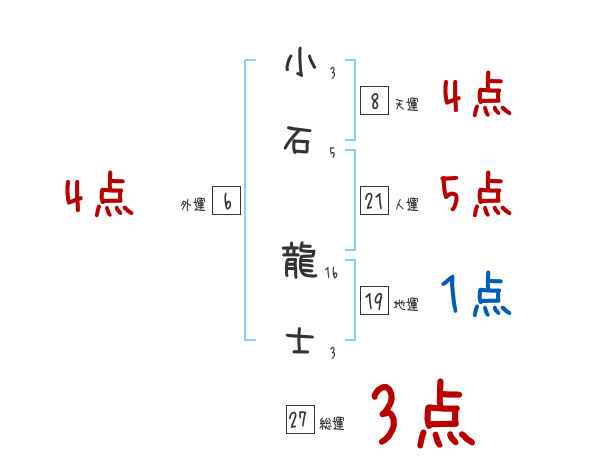 人運![]() | 小石龍士さんの人運は21画の5つ星!統率力がある。独立し成功する。名誉を手に入れる。 性格や才能などを表す2番目に重要な運勢です。人間関係や協調性、社会的な成功に影響します。主に20歳から50歳ぐらいまでの中年期の運勢を表します。 |