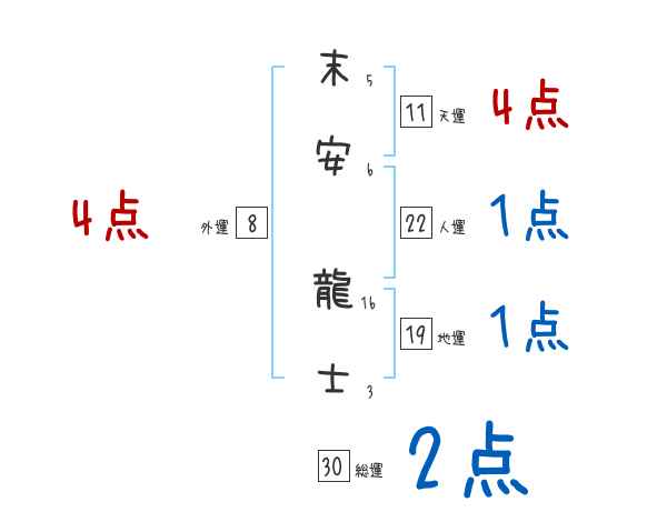 天運![]() | 末安龍士さんの天運は11画の4つ星!着実に富や地位を得る幸運な人生。 家系が持つ宿命的な運勢を表します。祖先から受け継いだ苗字ですので自分の力が及びません。家柄を象徴します。 |