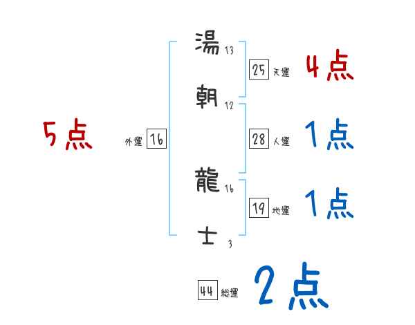 総運![]() | 湯朝龍士さんの総運は44画の2つ星!誠実で慎重な性格。物事を考えすぎないように注意しましょう。 あなたの人生を表す1番重要な運勢です。生涯を通じて影響する総合運となり、主に50歳以降の晩年期に影響を及ぼします。 |