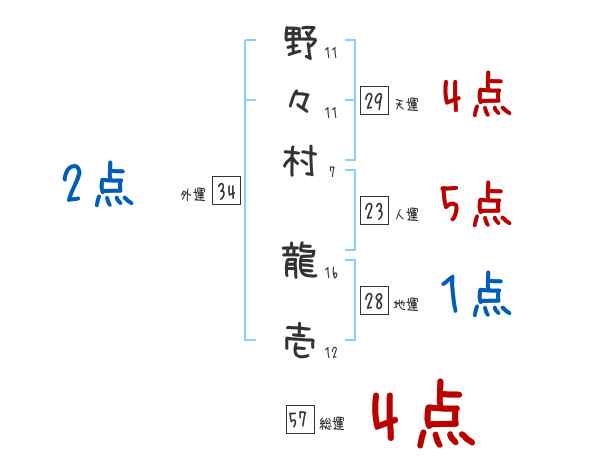 天運![]() | 野々村龍壱さんの天運は29画の4つ星!完全主義で才能がある。厳格な心の持ち主。 家系が持つ宿命的な運勢を表します。祖先から受け継いだ苗字ですので自分の力が及びません。家柄を象徴します。 |