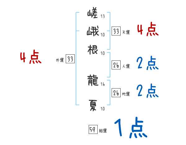 天運![]() | 嵯峨根龍夏さんの天運は33画の4つ星!権力志向でプライドが高い。勇気があり運を切り開き成功する。 家系が持つ宿命的な運勢を表します。祖先から受け継いだ苗字ですので自分の力が及びません。家柄を象徴します。 |