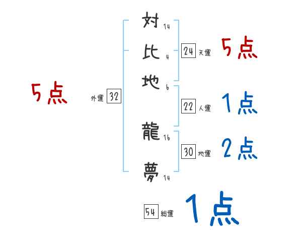 外運![]() | 対比地龍夢さんの外運は32画の5つ星!柔軟性があり成功する。チャンスが多く金運が良い。 生活面を象徴する運勢です。外部から受ける影響力を表し、結婚運、家庭運や職場、環境への順応性を表します。 |