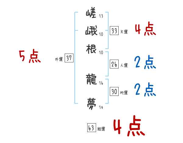 総運![]() | 嵯峨根龍夢さんの総運は63画の4つ星!家庭運がよく順調な生活。温和な性格。 あなたの人生を表す1番重要な運勢です。生涯を通じて影響する総合運となり、主に50歳以降の晩年期に影響を及ぼします。 |