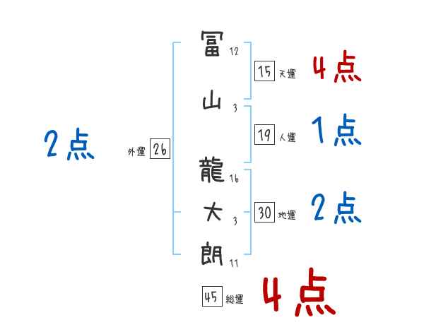 外運![]() | 冨山龍大朗さんの外運は26画の2つ星!波瀾万丈かも。信頼できる人を大事にしましょう。 生活面を象徴する運勢です。外部から受ける影響力を表し、結婚運、家庭運や職場、環境への順応性を表します。 |