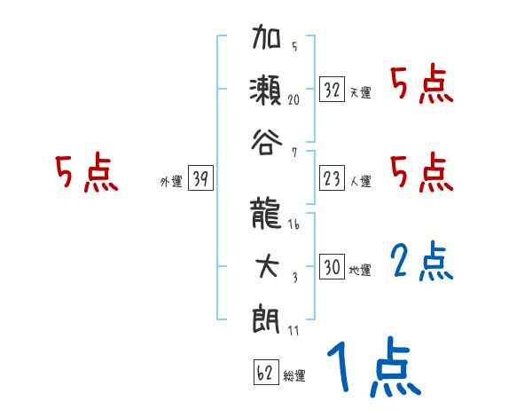外運![]() | 加瀬谷龍大朗さんの外運は39画の5つ星!社交性に優れ人望が厚い。人の上に立ち成功する。 生活面を象徴する運勢です。外部から受ける影響力を表し、結婚運、家庭運や職場、環境への順応性を表します。 |