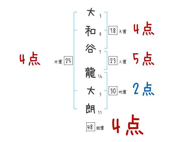 天運![]() | 大和谷龍大朗さんの天運は18画の4つ星!情熱的で剛気。忍耐力があり信頼される。 家系が持つ宿命的な運勢を表します。祖先から受け継いだ苗字ですので自分の力が及びません。家柄を象徴します。 |