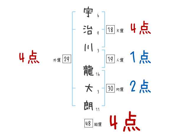 天運![]() | 宇治川龍大朗さんの天運は18画の4つ星!情熱的で剛気。忍耐力があり信頼される。 家系が持つ宿命的な運勢を表します。祖先から受け継いだ苗字ですので自分の力が及びません。家柄を象徴します。 |