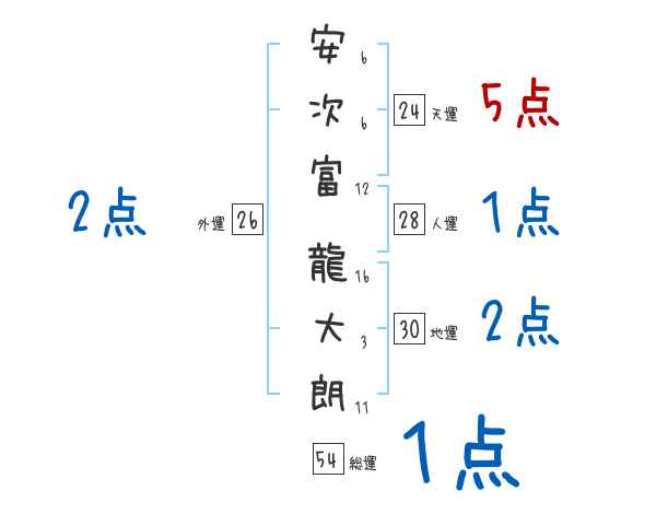 外運![]() | 安次富龍大朗さんの外運は26画の2つ星!波瀾万丈かも。信頼できる人を大事にしましょう。 生活面を象徴する運勢です。外部から受ける影響力を表し、結婚運、家庭運や職場、環境への順応性を表します。 |