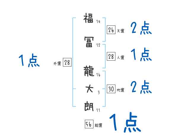 総運![]() | 福冨龍大朗さんの総運は56画の1つ星!消極的で無気力になりがち。誠実な気持ちが必要でしょう。 あなたの人生を表す1番重要な運勢です。生涯を通じて影響する総合運となり、主に50歳以降の晩年期に影響を及ぼします。 |