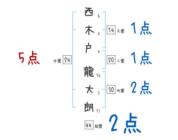 外運![]() | 西木戸龍大朗さんの外運は24画の5つ星!家庭運が良く順調な人生。金運にも恵まれる。 生活面を象徴する運勢です。外部から受ける影響力を表し、結婚運、家庭運や職場、環境への順応性を表します。 |