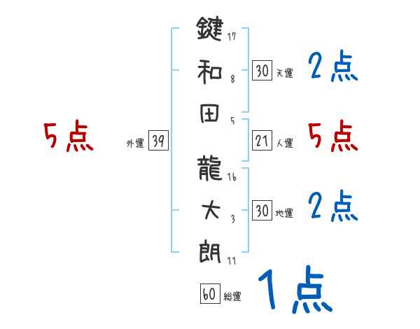 鍵和田龍大朗さんの画数の鑑定結果