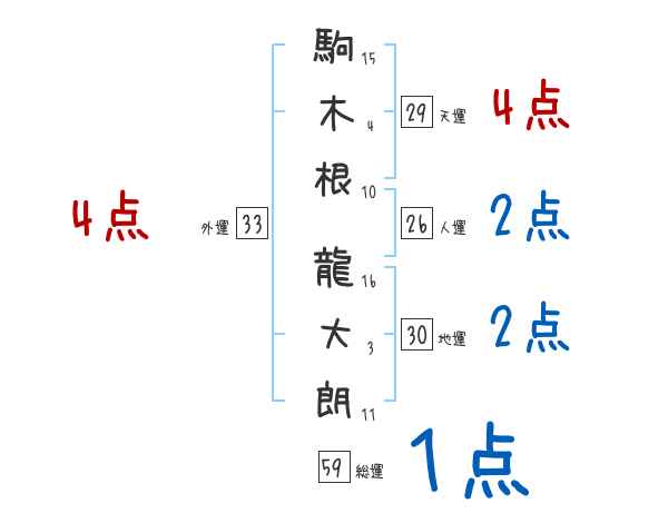 天運![]() | 駒木根龍大朗さんの天運は29画の4つ星!完全主義で才能がある。厳格な心の持ち主。 家系が持つ宿命的な運勢を表します。祖先から受け継いだ苗字ですので自分の力が及びません。家柄を象徴します。 |