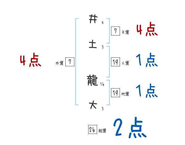 天運![]() | 井土龍大さんの天運は7画の4つ星!強い意志や信念を持ち独立心が強い。自立する。 家系が持つ宿命的な運勢を表します。祖先から受け継いだ苗字ですので自分の力が及びません。家柄を象徴します。 |