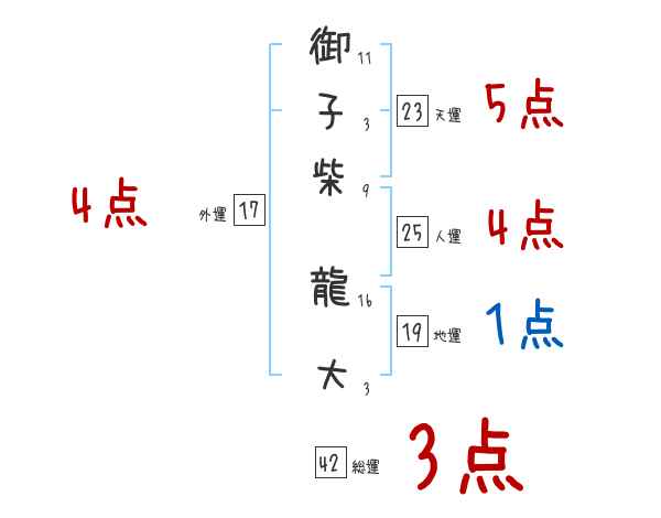 天運![]() | 御子柴龍大さんの天運は23画の5つ星!想像力に優れ活力がある。一代で成功し名誉を手に入れる。 家系が持つ宿命的な運勢を表します。祖先から受け継いだ苗字ですので自分の力が及びません。家柄を象徴します。 |