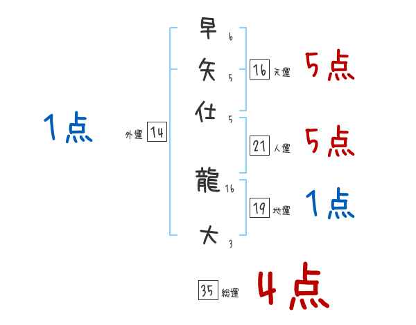 天運![]() | 早矢仕龍大さんの天運は16画の5つ星!人望が厚く大きく発展する。逆転成功が見える。 家系が持つ宿命的な運勢を表します。祖先から受け継いだ苗字ですので自分の力が及びません。家柄を象徴します。 |
