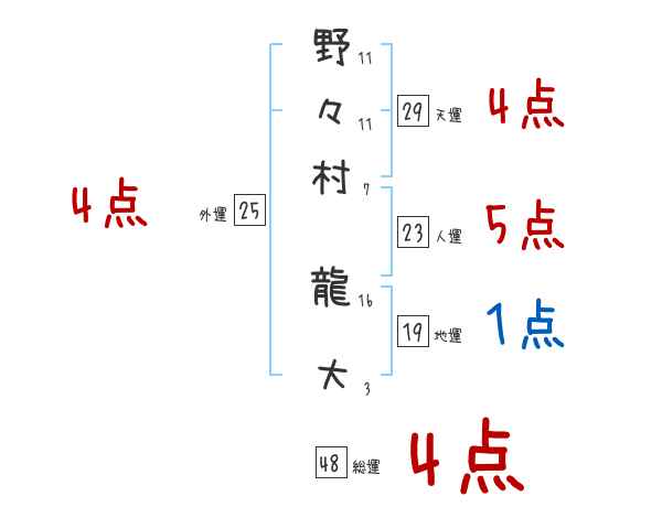 天運![]() | 野々村龍大さんの天運は29画の4つ星!完全主義で才能がある。厳格な心の持ち主。 家系が持つ宿命的な運勢を表します。祖先から受け継いだ苗字ですので自分の力が及びません。家柄を象徴します。 |