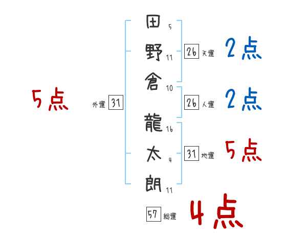 総運![]() | 田野倉龍太朗さんの総運は57画の4つ星!向上心があり人望がある。地位を得る。 あなたの人生を表す1番重要な運勢です。生涯を通じて影響する総合運となり、主に50歳以降の晩年期に影響を及ぼします。 |